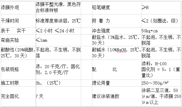 一.主要組成:該産品是厚漿型,以環氧樹脂、煤焦瀝青、顔料、助劑和溶劑等組成的漆料爲乙組份,另一組份爲特種環氧固化劑的雙組份自幹塗料。 二.主要特性:漆膜具有優良附著力、耐沖擊性、耐水性;高防鏽性能和良好的抗化學品性及耐油性,良好的耐磨性能。 三.主要用途:廣泛用於船底、壓載水倉、碼頭鋼樁、礦井鋼鐵支架、酸槽、自來水管道以及工礦企業冷卻水管道的外壁防腐用底、面漆。 四.技術指标如下表:
